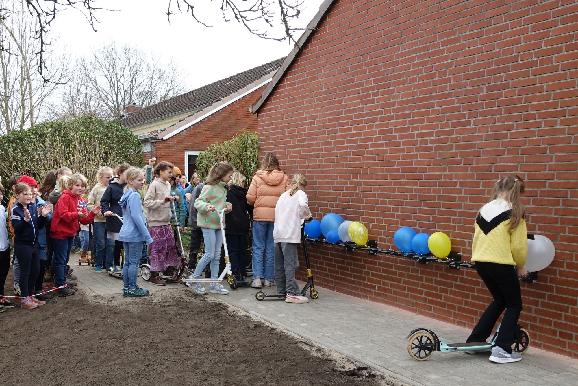 Und so kam es, wie es kommen musste: Wir erhielten den Zuschlag für die Höchstfördersumme von 750 € zur Anschaffung der Rollerständer und freuen uns ab sofort über geordnete Verhältnisse auf dem Schulgelände. – Denn Bestellung, Lieferung und Montage gingen ganz schnell. Und der Bürgermeister spendierte uns sogar noch Zuwegung und Pflaster für den neuen Stellplatz. Was für eine gelungene Kooperation!