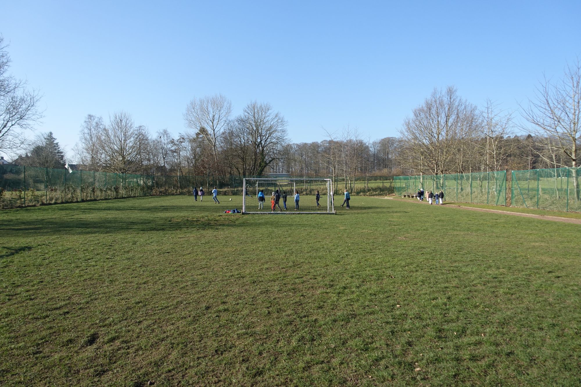 Weitläufiger Bolzplatz mit zwei Fußballfeldern inkl. Tore zum Fußballspielen, Rennen und Toben